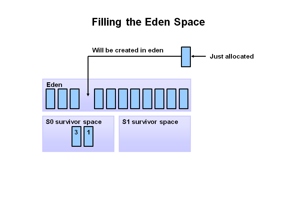 Eden 영역에 새 객체가 할당된다. survivor 영역의 S0, S1 영역은 모두 비어있다.