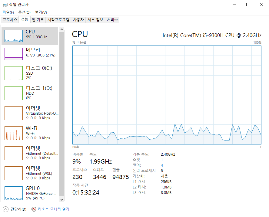작업 관리자 > 성능 메뉴로 진입하여 가상화: 사용을 확인한다.