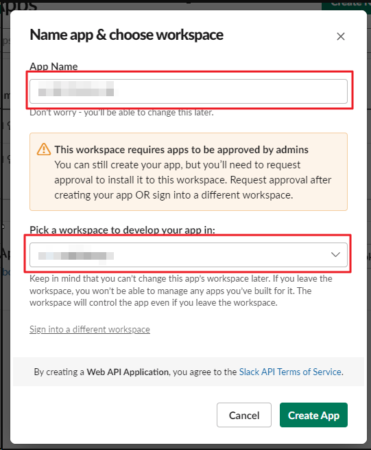 Step3: "APP Name" 을 설정하고 "workspace"를 <workspace>를 선택