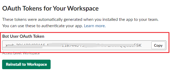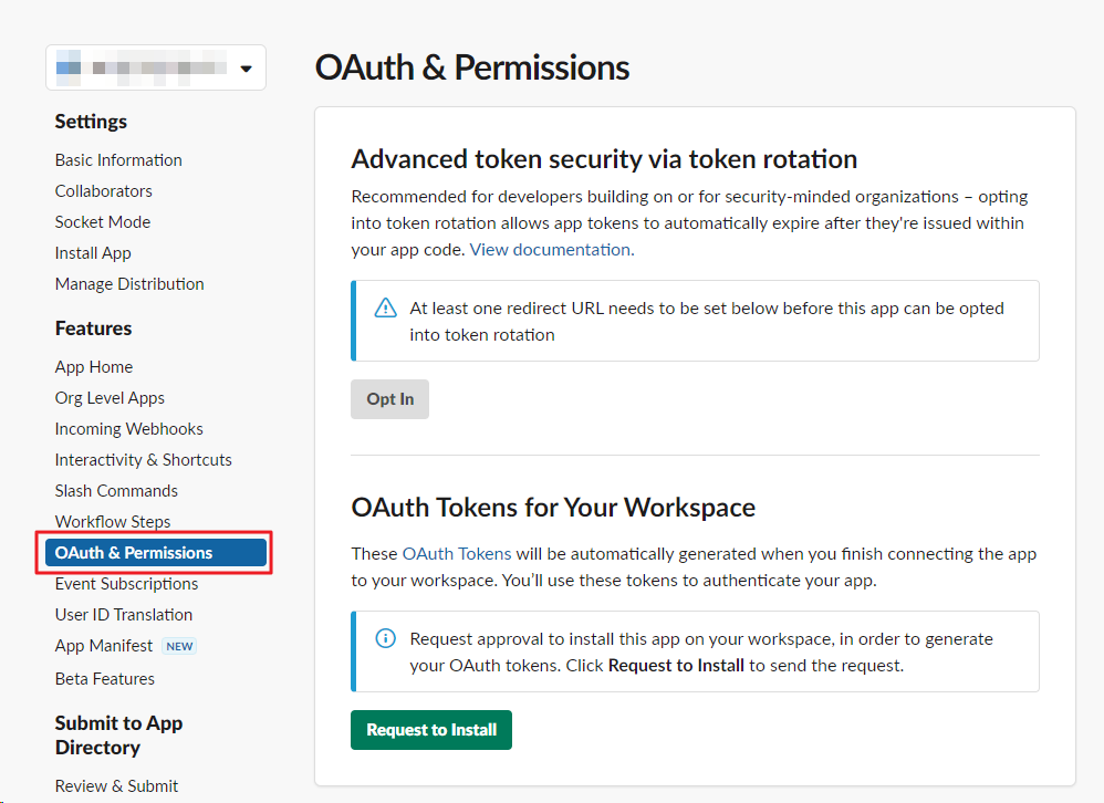 메뉴 "Basic Information" > OAuth & Permissions > OAuth Tokens for Your Workspace