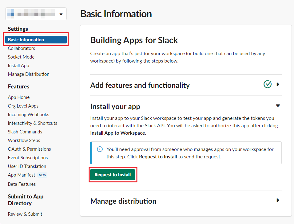 자 이제 설정이 다 완료되었다. 이제 해당 workspace에 앱을 설치하기 위하여 관리자에게 승인을 받아야 한다.