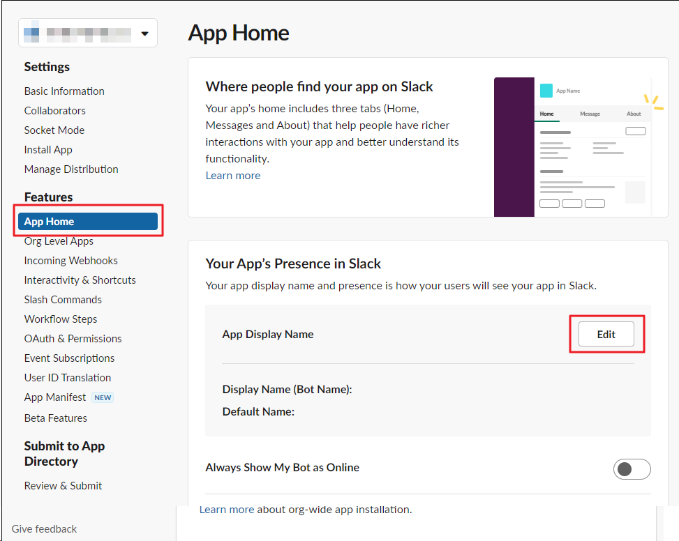 Step1: 메뉴에서 "APP Home" 을 클릭하고 아래 보이는 "Edit" 버튼을 클릭