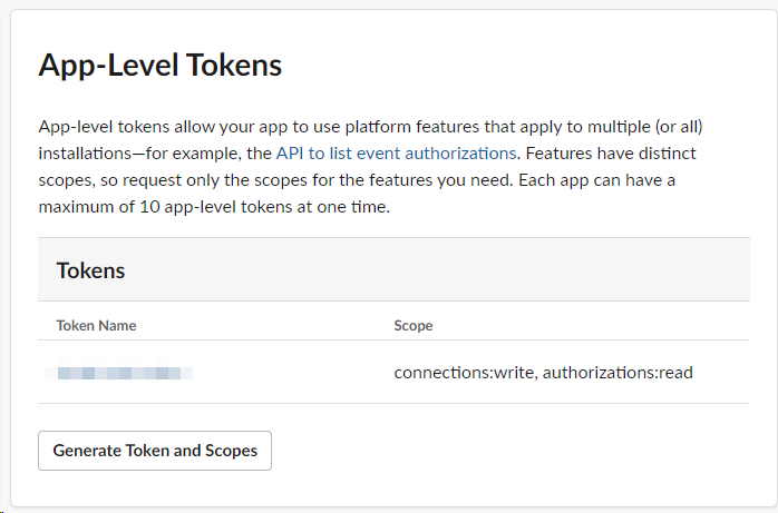 Socket 통신을 하기 위하여 App-Level 토큰을 생성해야한다.