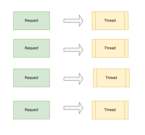 Thread Per Request 모델은 웹 서버에서 요청이 들어올 때마다 새로운 스레드를 생성하여 해당 요청을 처리하는 방식이다. 각 요청은 독립적으로 실행되기 때문에 동시에 여러 요청을 처리할 수 있다.