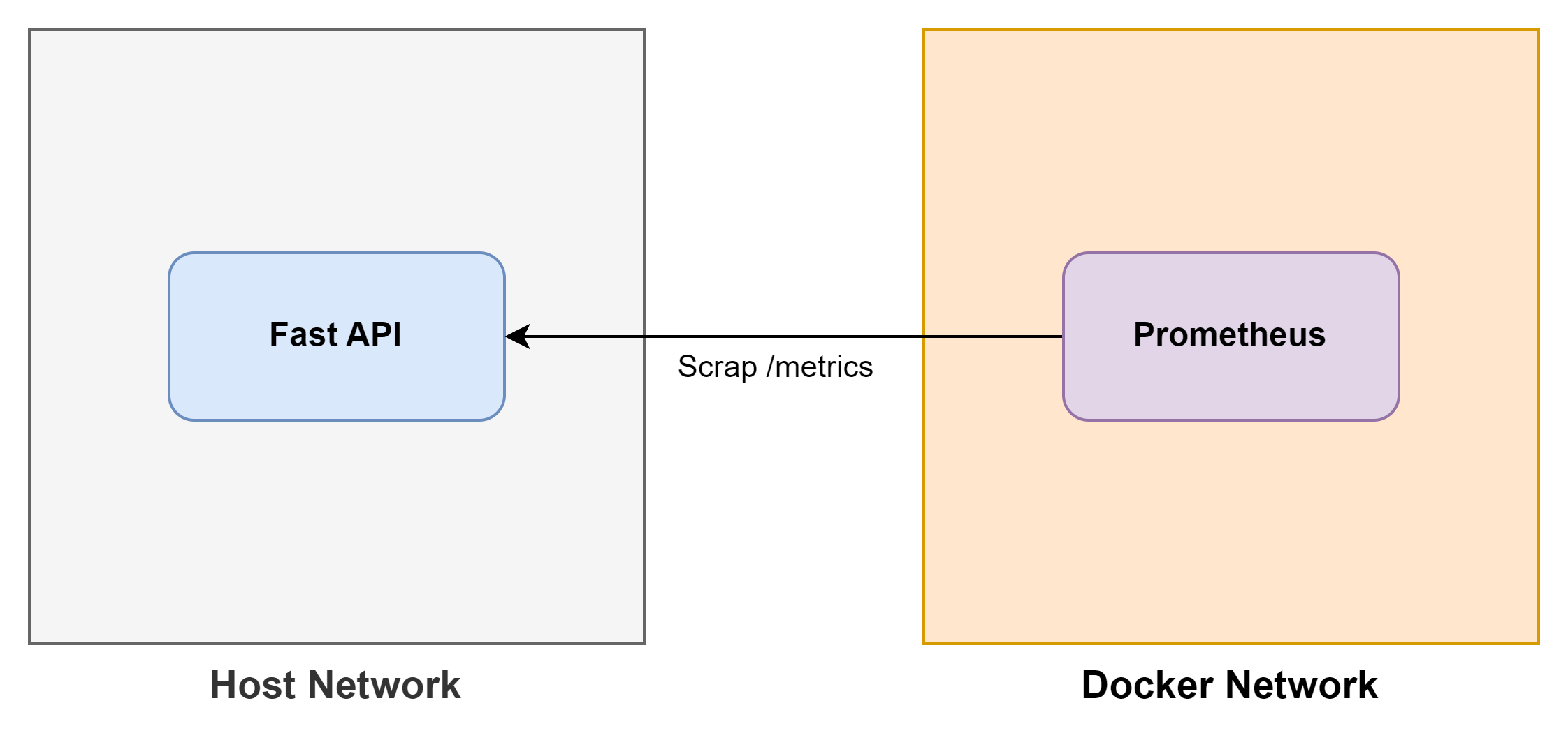 Docker를 사용하여 Prometheus 서버를 구동하고 호스트에서는 FastAPI를 사용하여 웹 서버를 실행한다.