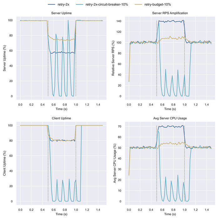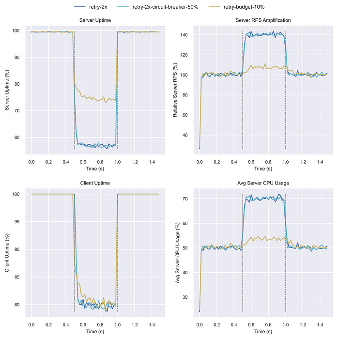 결론적으로, 재시도 예산과 회로 차단기는 서버 안정성을 높이지만, 클라이언트 가동 시간이나 서버 부하와의 트레이드오프가 존재함.
