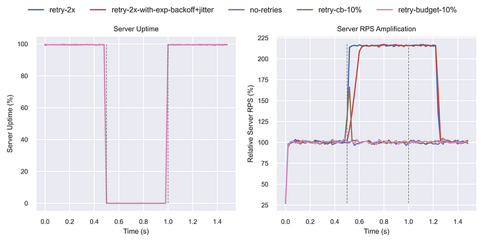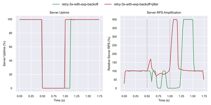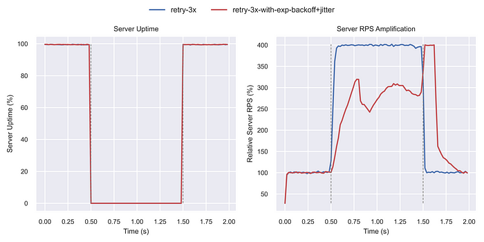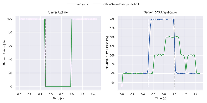 서버 다운타임 동안 부하 증폭이 상당히 감소하였다. 지수적 백오프와 단순 재시도 간의 차이가 훨씬 더 두드러졌다.