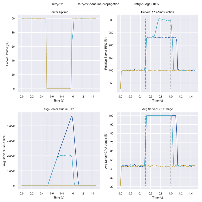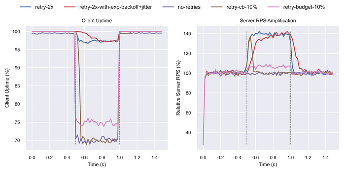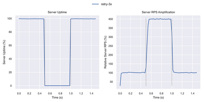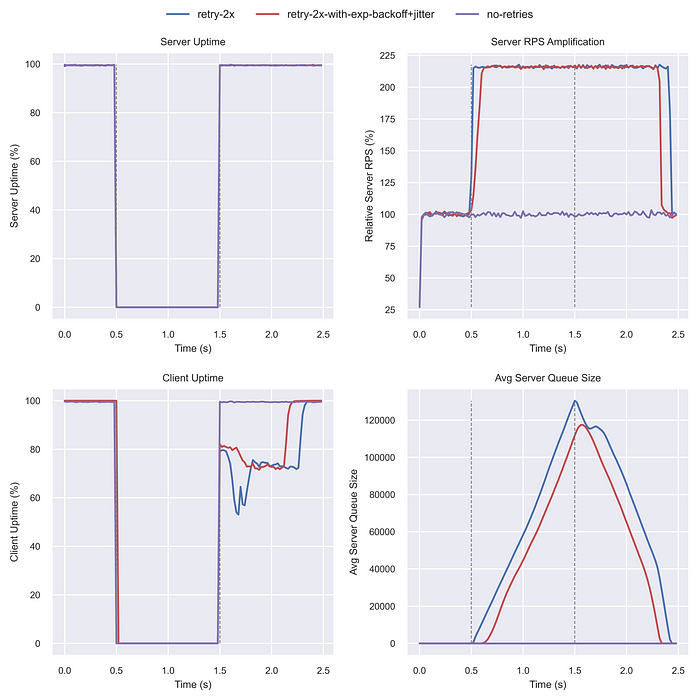 따라서 단기간의 다운타임이나 빠른 자동 확장에는 효과적일 수 있지만, 특정 다운타임 임계값 이후에는 서버 부하를 줄이는 데 효과가 없었다. 결국 서버는 재시도로 인해 압도되었다.