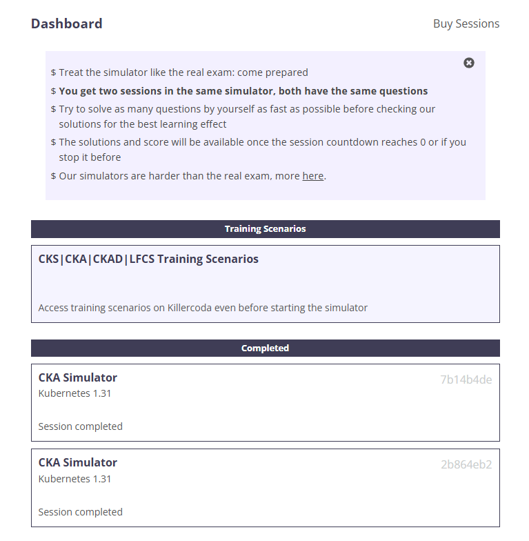 시험과 유사한 문제 유형을 제공해준다. 안내문을 읽어보면 알겠지만 실제 CKA 시험 난이도는 이보다 쉽기 때문에 너무 부담 갖지 말고 한번 풀이해 보면 될듯하다.